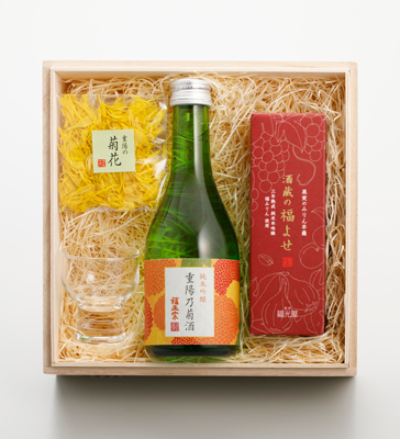 重陽乃菊酒と菊花、清酒グラス、福光屋オリジナルのおめでたい羊羹“福よせ”を詰め合わせた上品なギフトセットです。敬老の日の贈り物や手土産にご活用ください。豊かな香りとやわらかくふくらむ旨味、キレの良い後味が特徴。邪気を祓い長寿を祈る菊酒として、冷やからぬる燗までお好みの温度でお召し上がりください。