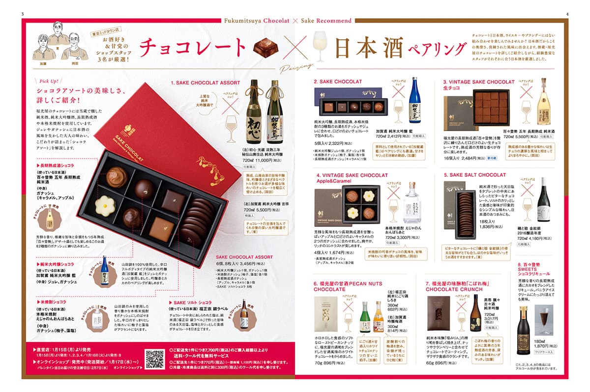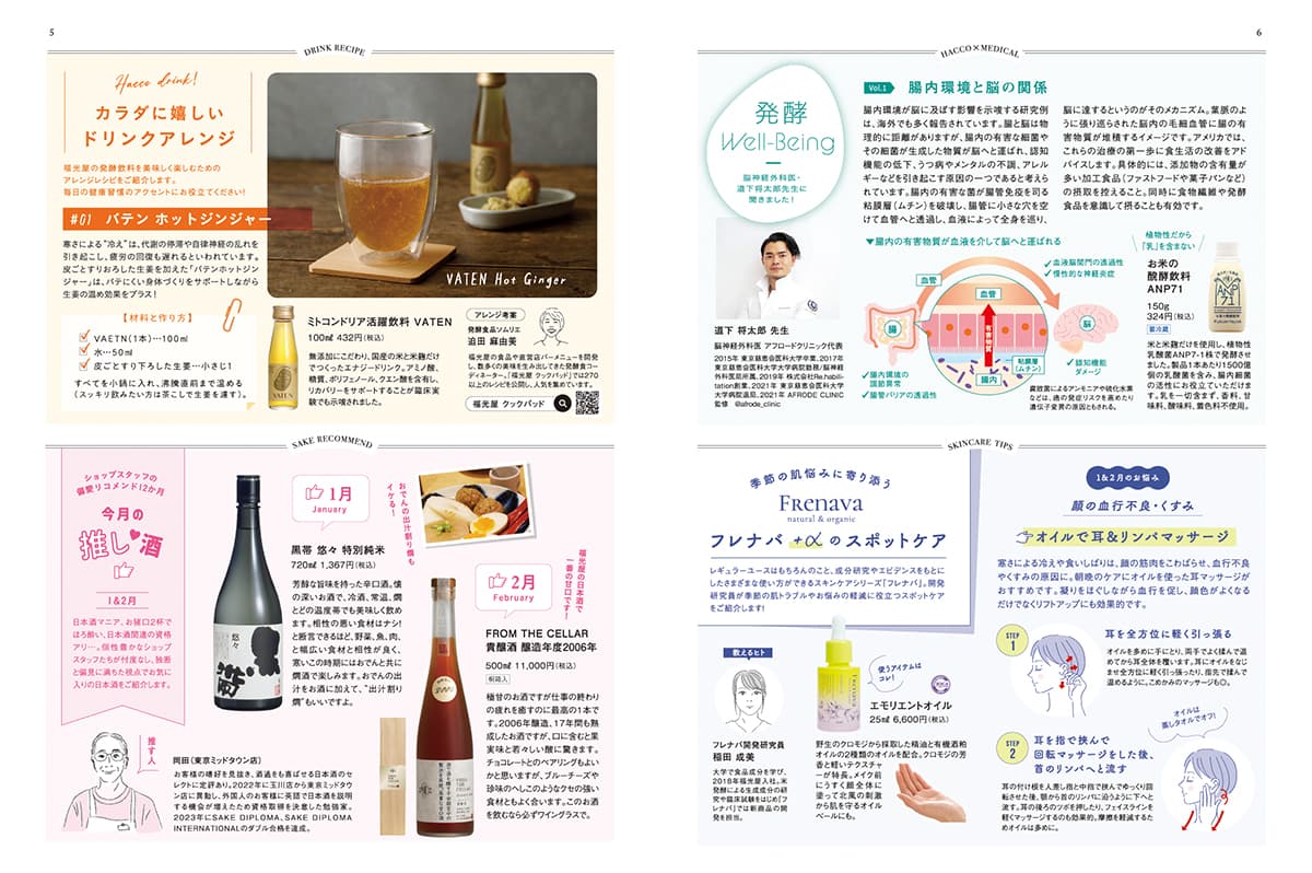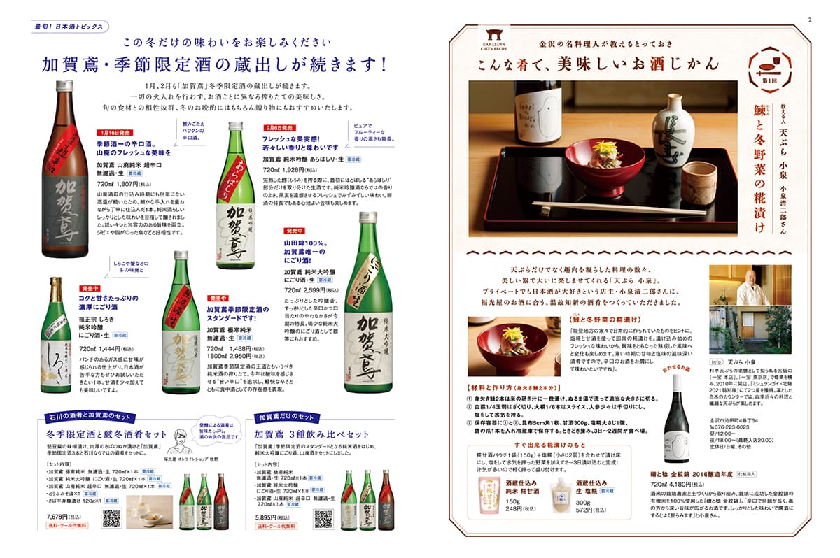 今号の特集は“日本酒ショコラ”。福光屋の純米大吟醸酒、長期熟成酒や本格米焼酎を使ったさまざまなチョコレートを詳しくご紹介するとともに、日本酒好きにも、チョコレート好きにも新しい世界を楽しんでいただこうと、日本酒とチョコレートのペアリングを考えてみました。季節限定酒の蔵出し情報をはじめ、健康と美容に役立つ4つのコラム連載も新たにスタート。発酵飲料レシピ、腸活にまつわるドクターのアドバイス、オーガニック基礎化粧品「フレナバ」の使いこなし、ショップスタッフの“推し酒”紹介を掲載しています。ぜひお手にとってご覧ください。