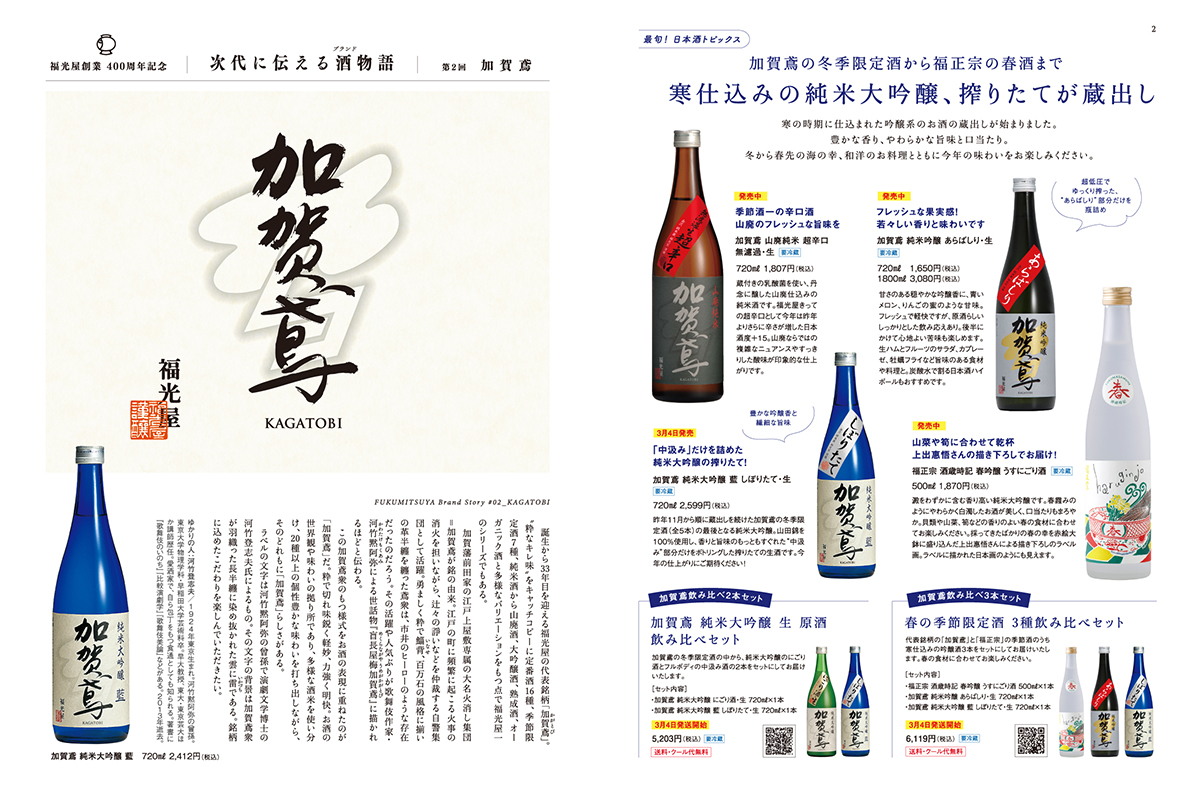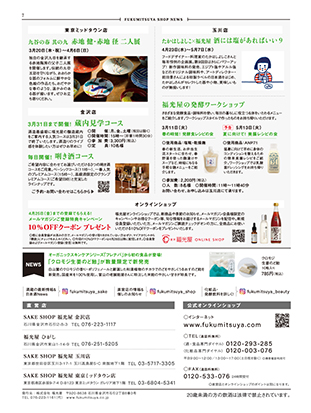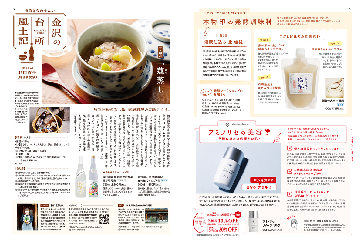 特集では、春からの新生活・発酵習慣の参考にしていただこうと、福光屋の発酵飲料全8種を詳しくご紹介。成分の違いが明確におわかりいただけるよう、チャートを使って可視化してみました。健康習慣のヒントにぜひお役立てください。その他、寒仕込みの純米大吟醸春の蔵出し情報をはじめ、コラム連載では金沢の料理研究家・谷口直子さんによる「蓮蒸し」レシピ、酒蔵の調味料「酒蔵仕込み 生 塩糀」や化粧品「アミノリセ」をご紹介。日本酒をはじめ、さまざまなアイテムで発酵のある暮らしをご提案しています。ぜひお手にとってご覧ください。
