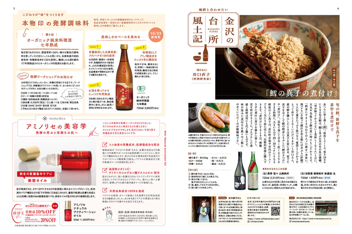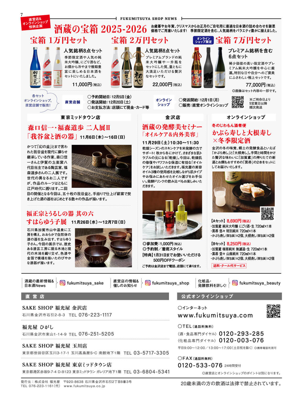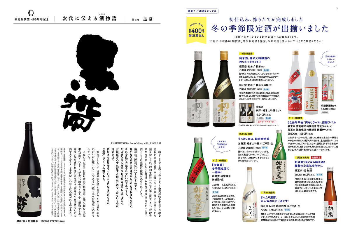 さまざまな味わい、山廃酒や生酒など造りや酒米の違い、十酒十色をぜひお楽しみください。福光屋は10月下旬より、今期の搾りたての新酒をお届けしてまいります。年内に発売される季節限定酒を発売日とともにお知らせする蔵出し情報のほか、料理研究家・谷口直子さんによる金沢の冬の味「鱈の真子の煮付け」のレシピもご紹介。2025年の締めくくりを日本酒とともに! ぜひお手にとってご活用ください。