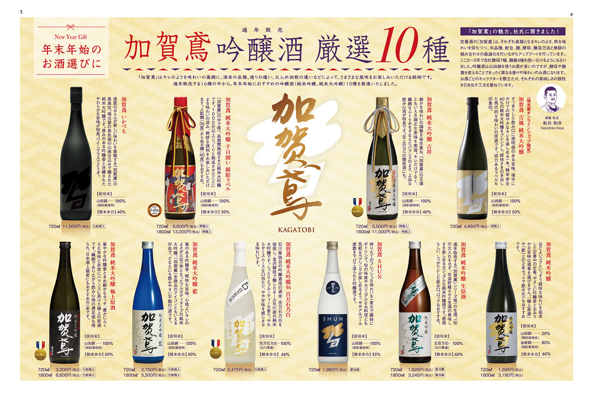 特集は、年末年始に飲みたい、贈りたい「加賀鳶」の吟醸酒10種を一挙にご紹介。