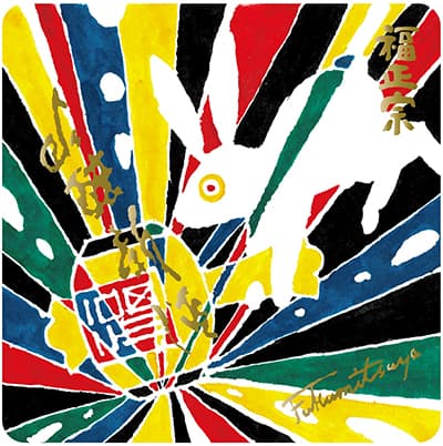 白い兎が大きな打ち出の小槌を勢いよく振り下ろし、五色の閃光が走るアートラベルは、九谷焼・上出長右衛門窯の後継者、上出惠悟氏による描き下ろしです。兎は「躍進」の象徴として縁起が良いとされ、神話「因幡の白兎」に登場するだいこくさまが手にする打ち出の小槌は福光屋の古くからの標し。力強いラベルデザインが、世界に希望と幸せを与えてくれそうです。