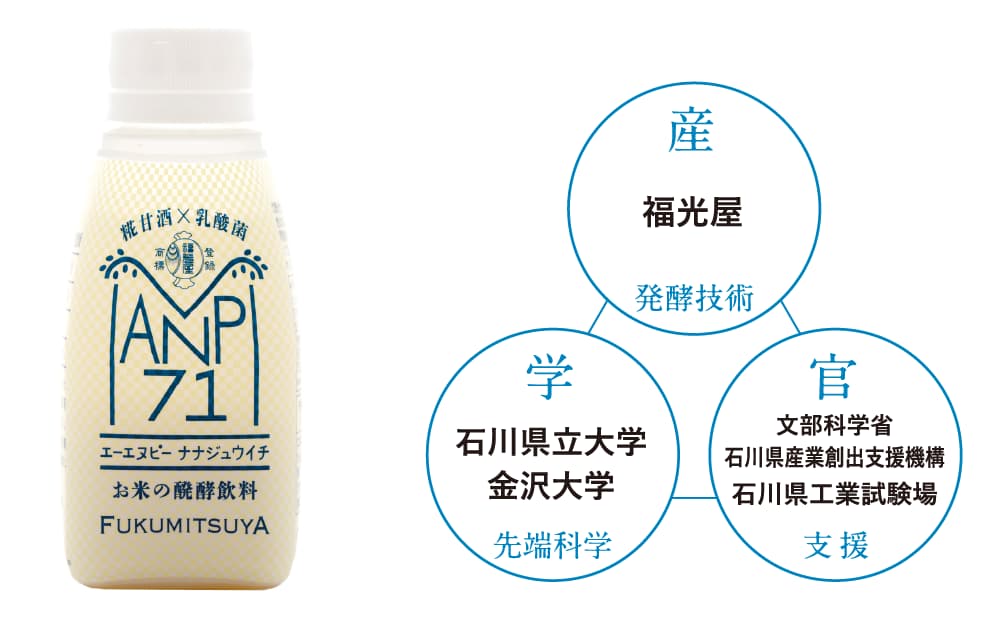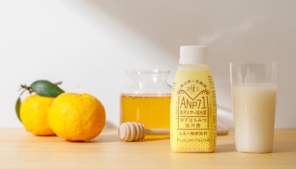 「ANP71」は産学官連携の共同研究開発により2013年に誕生した米と麹の乳酸菌ドリンク。本プロジェクトは、学生の「出会いと学び」の機会創出のため金沢大学FSSIが実施する金沢大生向け地域参加型教育事業「Project:AERU」の一環として、同学学生8名と共同で昨年10月から始動し、「ANP71」の新フレーバーの開発からパッケージデザインの検討、販売方法や広告などのマーケティング戦略までを企画し、取り組んだものです。