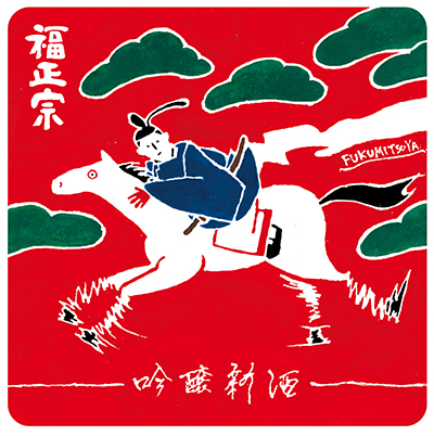 白馬のアートラベルは九谷焼・上出長右衛門窯の六代目、上出惠悟氏による描き下ろし。平安貴族が束帯の裾(きょ)をたなびかせ、駿馬の脚が霞むほどに疾走する様がユーモラスです。短冊ラベルの西暦には蹴鞠(けまり)が象られています。