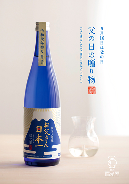 今年も福光屋の直営店と直営オンラインショップを中心に、6月16日(日)の父の日に向けて「お父さん 日本一」のメッセージを配した純米大吟醸、特別純米菰冠・豆樽、八年熟成本格米焼酎などを限定発売いたします。