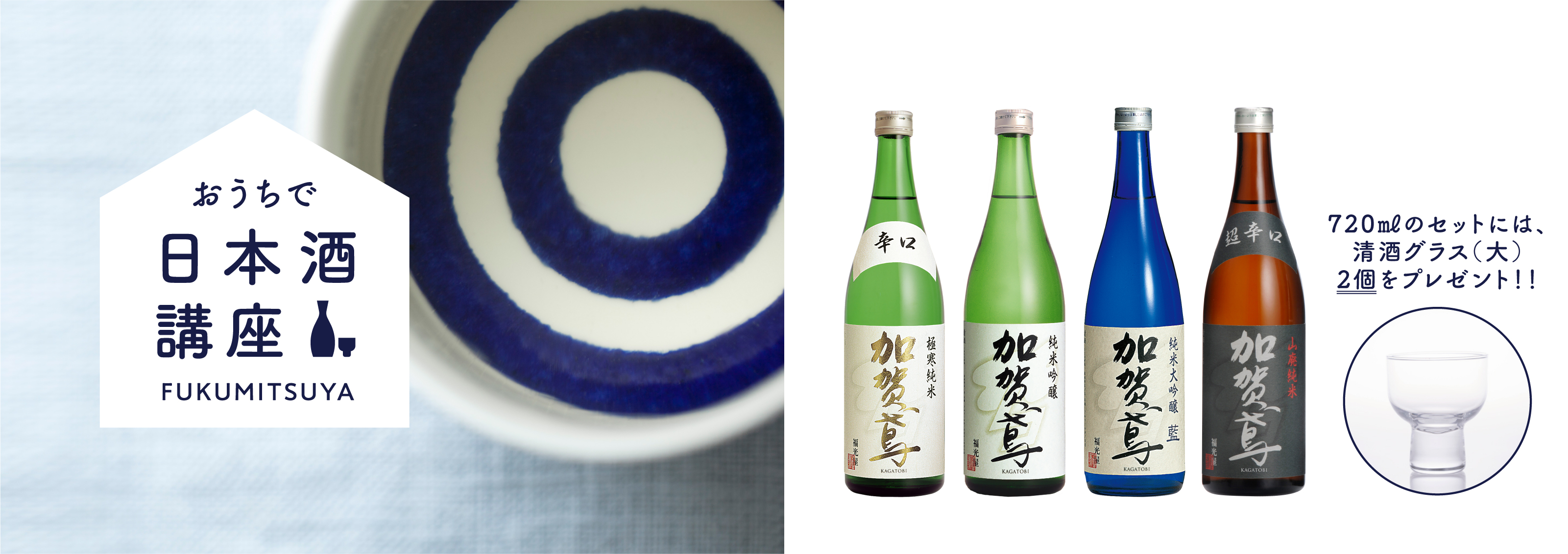 講座の内容に合わせて代表銘柄「加賀鳶」から厳選した4種をセレクト。福光屋の生産部部長・正司和利(1983年入社、酒造技能士1級/日本ソムリエ協会認定SAKE DIPLOMA)が、日本酒の原料や製造工程についてわかりやすく解説します。それぞれの日本酒の魅力、味わい、酒肴との相性などをより深くお楽しみいただける蔵元ならではの充実した内容です。お試し用として300mlの小瓶セットと、清酒グラス(大)×2個付のお得な720mlのセットをご用意しました。