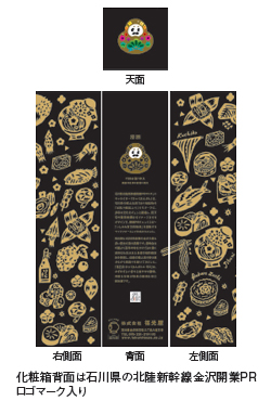 石川県の郷土玩具であり縁起物の「加賀八幡起上り」をモチーフにした石川県の北陸新幹線PRマスコットキャラクター「ひゃくまんさん」を手がけた石川県出身のグラフィックデザイナー・田中聡美氏によるデザイン。「石川の食とお酒の友」をテーマに描かれたユーモラスなイラストを金色の箔押しと重厚感のある黒を基調に表現し、加賀百万石の城下町・金沢の地酒を訴求します。商品名は、キャラクター名「ひゃくまんさん」と加賀藩の石高「百万石」から命名しました。