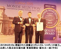 株式会社 福光屋(本社・金沢市)の代表銘柄「福正宗」の純米1.8Lパック3商品は、「2016年モンドセレクション」(本部・ベルギー ブリュッセル)において4年連続となる金賞を受賞しました。世界に認められた日常の純米酒の美味しさを、さらに訴求していきます。